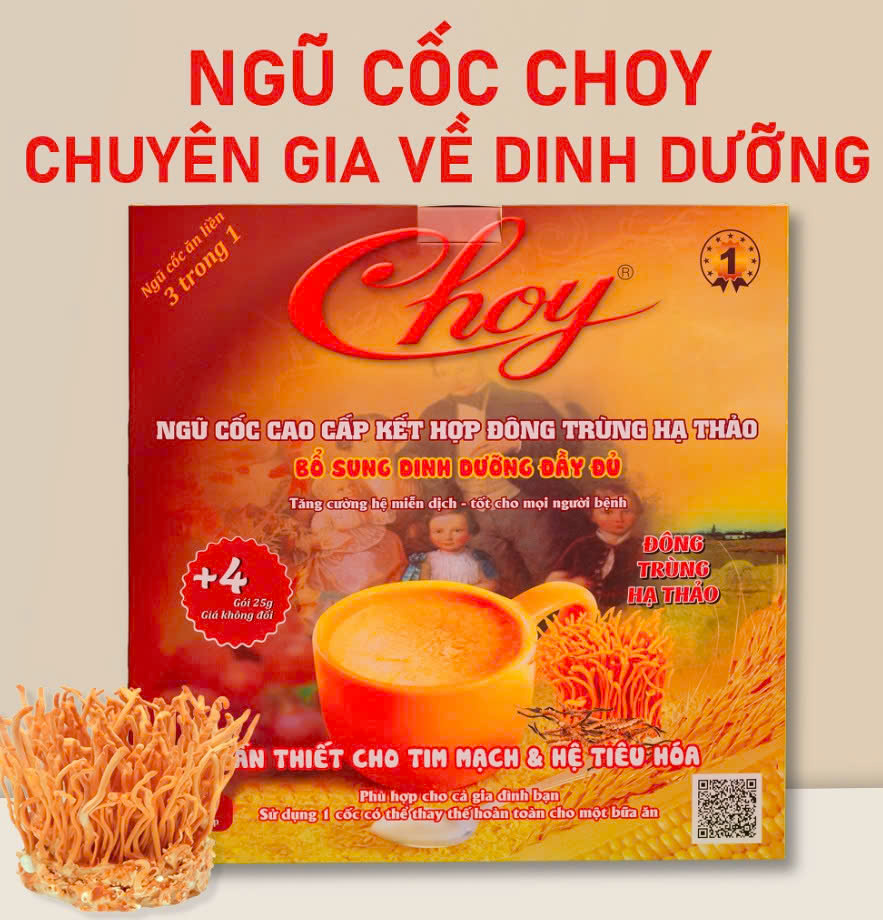 Ngũ cốc Đông trùng hạ thảo sản phẩm được bổ sung Dinh Dưỡng đầy đủ và kết hợp với Đông trùng hạ thảo (trong đông trùng hạ thảo giàu đạm, hàm lượng canxi cao, có chất ngừa ung thư, chống lão hóa. Sản phẩm còn Hỗ trợ kiểm soát đường huyết, giảm cholesterol xấu, cho hệ thần kinh, tim mạch, thiếu máu, miễn dịch, tăng cường trí nhớ, cải thiện sinh lý), sản phẩm phù hợp cho mọi lứa tuổi nhất là người bệnh, mới ốm dậy (trẻ em từ 3 tuổi trở lên).